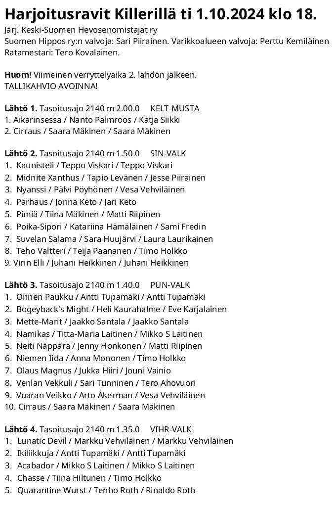 Osallistumismaksu harjoitusraveihin 10 €/ hevonen/ päivä. Vuoden 2024 radankäyttömaksun suorittaneilla maksu 5 €/ hevonen. Poneille ei osallistumismaksua.