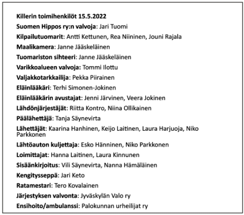 Mukana menossa: Aalman Oy & K-S Rakennus ja Raudoitus, Suomen Tivoli, OP Petäjävesi, Atupem, ProHay, Back On Track, Hevosklinikka Laukaa & Kuopio, Oskutuote, Kraft, Suvi Säilöheinä, Topiron, Konneveden hys, Killerin Ravinuoret.