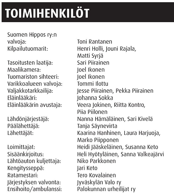 Mukana menossa: 360 Palvelut, Keski-Suomen Rakennus-ja Raudoitus, Velj. Wahlstén & Yara, Siparila, Hevosklinikka Laukaa, Hankkija, Hevosurheilu, Alva, Valtra, Veljekset Wahlstén, Taitola Hoivapalvelut, Killerin Ravinaiset.