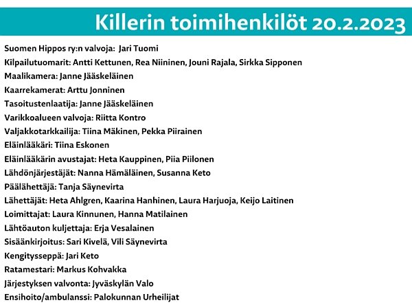 Koko perheelle on luvassa rutkasti ohjelmaa! Killerin ravinuorten ponikerho starttaa klo 17 - tule tutustumaan toimintaan. MLL Järvi-Suomen piiri on paikalla kertomassa Heppakaveritoiminnasta. Lapsille lisäksi mm. kasvomaalausta, poniajelua, mäenlaskua jne. Aikuisille lisäksi ohjattu tallikierros. Ravintola Pegasuksesta löytyy aloittelijoiden aitio, voit kysyä vapaasti kaikkea hevosurheiluun liittyvää. Paikalla on vastaamassa raviurheilun moniosaaja Jarkko Koppeli.