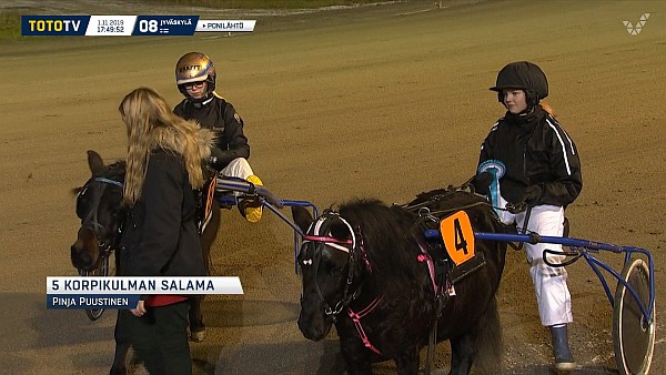 Ponilähdön voittaja Korpikulman Salama ja Pinja Puustinen, oikealla kakkonen: Kaprifolens Rexona ja Rosaliina Lintunen.