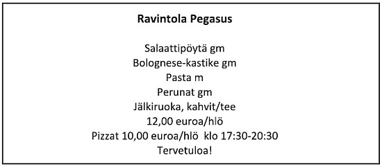 · Ravintola Pegasus 12 € (sisäänpääsy portilta sekä Buffet ruokailu)