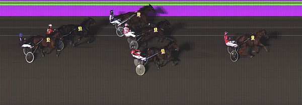 DAZZLING PRESS: Jäi kiertämään kolmatta rataa eteni keulaan runsas kierros jäljellä. Menetti paikkansa viim. takasuoralla ja kangistui keskipareihin.