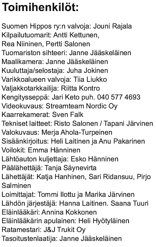 Mukana menossa: Horze, Hevari, Hevosklinikka Laukaa, Hankkija, Criollo Hevosrehut, Veljekset Wahlsten, Racing.