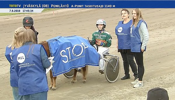 Ponilähdön voittaja: Zemafori ja Eveliina Hietanen. Mannerheimin Lastensuojeluliitto onnittelemassa.