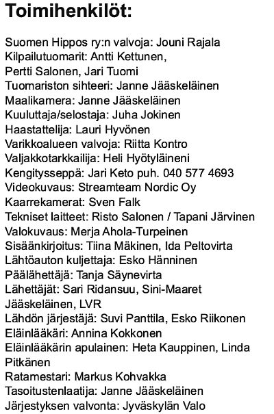 Mukana menossa: Criollo Hevosrehut, Saarijärven Pesu, K-Rauta Saarijärvi, Brobacka Stable, KL Häkä Oy, Kuljetus P. Perkiö Oy, Roppilax/Onnenlaakso, Hatol Oy, Hankasalmen Heinäravit 4.7.