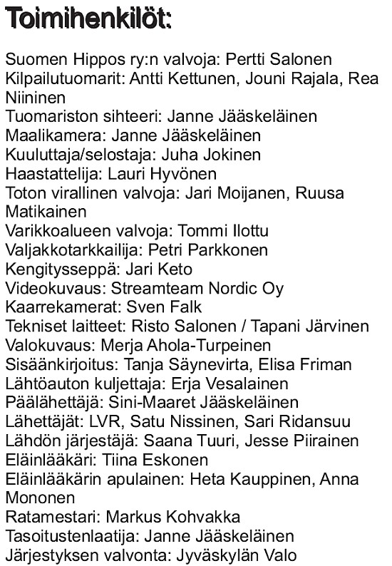 ROUVA KAASU: Laukkasi keskipareissa 1. takasuoralla, laukkasi maalisuoran alussa uudelleen. Kamppaili vielä harvassa porukassa viim. totosijastakin ennen toista laukkaansa.