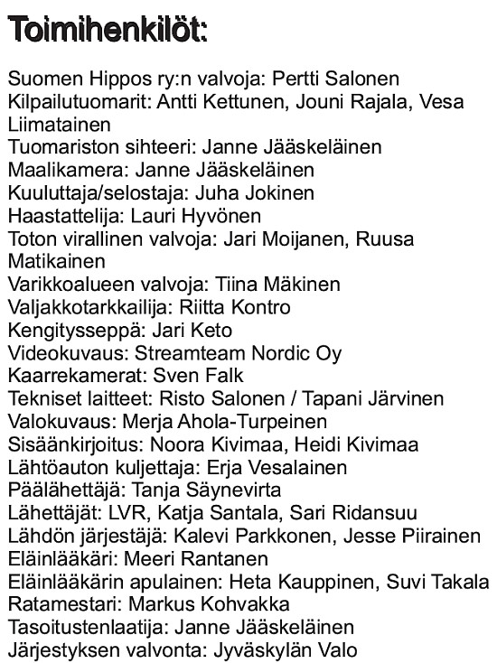EETI: Nousi 2. kurvin alussa hänniltä kolmannelle, joutui väistämään loppukurvissa pariin otteeseen kolarin vuoksi laukanneita ja menetti selvästi vauhtiaan ja hapuili itsekin. Kiri maalisuoran jälleen hyvin ja puristi kaukana voittaneen takana toiseksi.