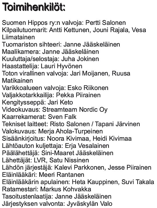 RALEN HUVIRI: Laukkasi runsas kierros jäljellä kakkossijalla lyhyesti harvassa porukassa. Laukkasi loppukurvin alkaessa pahemmin ja jäi kolmanneksi. Piti asemansa perille. OK+