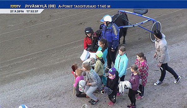 Ponilähdön voittaja Niemenpellon Zäpäkkä, ohjastajana Jenita Laitinen. Killerin Kepparikerho onnittelemassa.