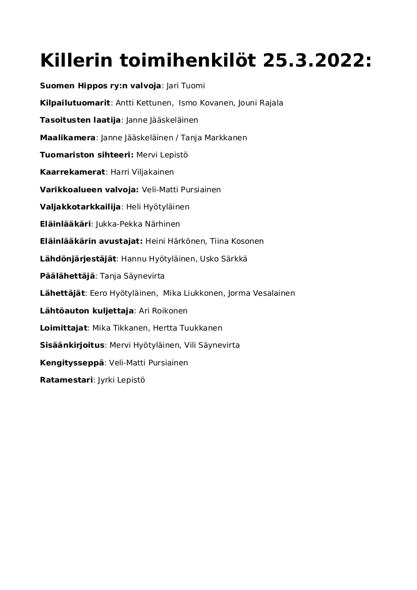 Mukana menossa: Rakennuspalvelu Matti Pulkkinen Oy, MTK Laukaa ja Laukaan Maatalousseura, Anne Korpinen Ky ja Parkkonen Racing, Laukaan kunta, Laukaa-Konnevesi Lehti, POP Konnevesi, KSRR ja Uusitalon hevostila, Mustakorppi, Hevosklinikka Laukaa, Laukaan Hevosystäväinseura, Biofarm ja Topiron ky.