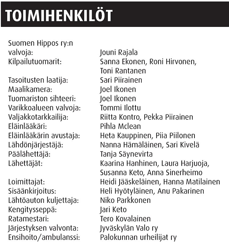 Mukana menossa: Kuninkuusravit Tampere 2026, Taitola hoivapalvelut, Raksa Pete, Suomen Ravivalmentajat ry, Palokan Grilli, Laukaan Tupaswilla, Riihivuori Resort, Setsuuri, Neeka, KS Hevosjalostusliitto ry, Killerin Ravinuoret.