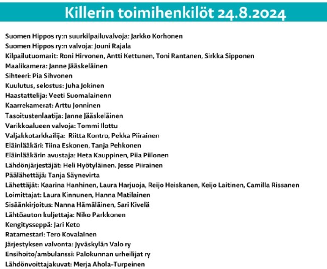 Mukana menossa: Speedex, Pyroll, Grano, KAK-Kuljetuspalvelu, Jyväskylän kaupunki, Hevosurheilu, Keskisuomalainen, Finntack & Yara, Sinebrychoff, Racing & Vapo, 360palvelut, Ympäristöhuolto Saarikko.