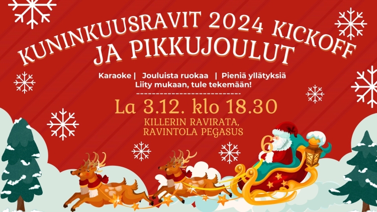 Rentoa pikkujoulumenoa ja asiaa Kuninkuusraveista 2024! Tätä on luvassa lauantaina 3.12. klo 18.30 alkaen Killerillä ravintola Pegasuksessa. Tervetulleita ovat kaikki, joita asia kiinnostaa – olitpa ollut aiemmin toiminnassa mukana tai et. Kuninkuusravit 2024 Killerillä on yhteinen ponnistus, johon tarvitaan reippaita tekijöitä monenlaisiin tehtäviin 💪