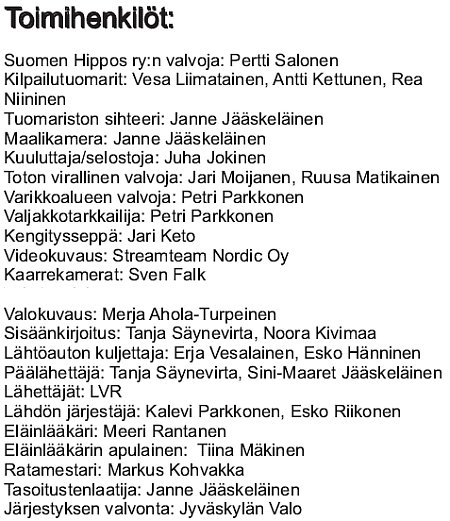 COCOMIN: Pääsi etusuoralla kolmannelta keskipareissa toisen jonoon, mutta kohosi pian uudelleen kolmannelle. Valui viim. takasuoralla taustalle. Tuli maalisuoran lujaa ja ehti vielä epätasaisessa lähdössä kuudenneksi. Ajolinjoissa oli paljon petrattavaa.