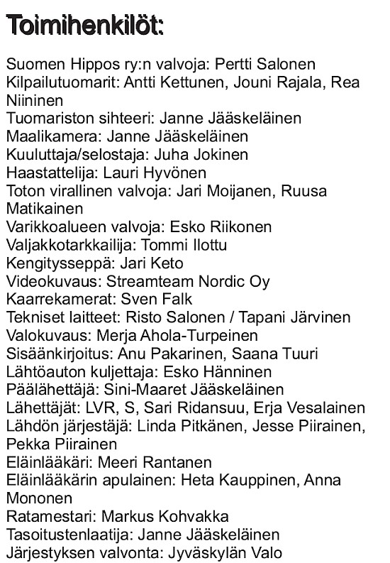 Opetuslähtö klo 16.45, koelähtö klo 16.57, nuoret-lähdöt klo 17.09 ja 17.30. Ponilähtö klo 17.45.