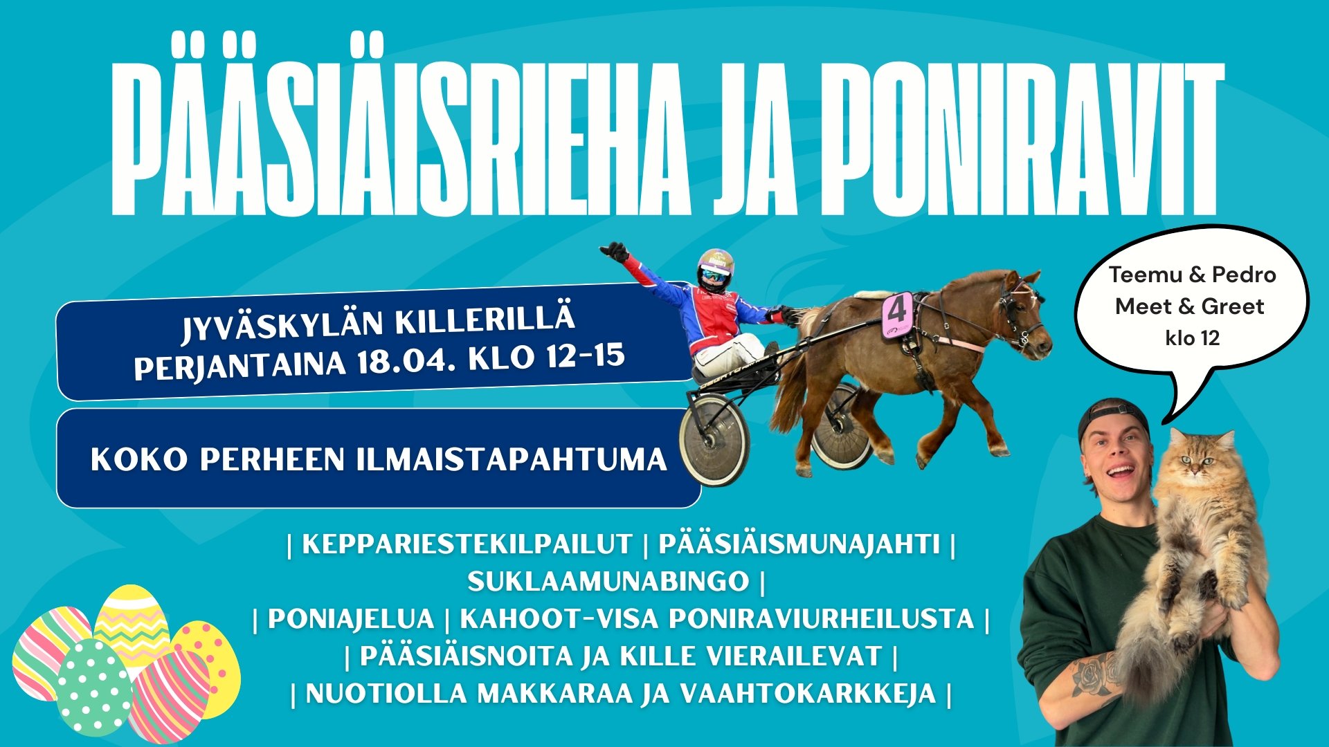 Pitkäperjantaina 18.4. klo 12 alkaen Killerillä viihdytään pääsiäisriehan ja poniravien merkeissä. Koko perheen ilmaistapahtumassa seurataan jännittäviä ponilähtöjä ja tarjolla on monenlaista oheisohjelmaa pääsiäismunajahdista poniajeluun ja kepparikisoihin.