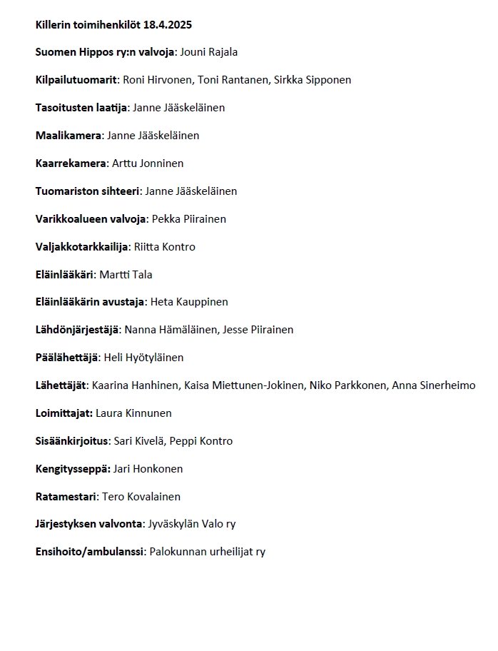 Menossa mukana: MTK-Keski-Suom, Killeri - vuoden 2024 poniravirata, Noblessa keittiöt/Rakennusliike T. Kolari, Hankasalmen Hys/Killerin Ravinaiset, Issakan Valo, Saharan Ravitalli, Ravitalli Terho Rautiainen, Ala-Keiteleen Hys, Konneveden Hys/Laukaan Hys, K-Market Tikkari/Lukkoluket Oy.
