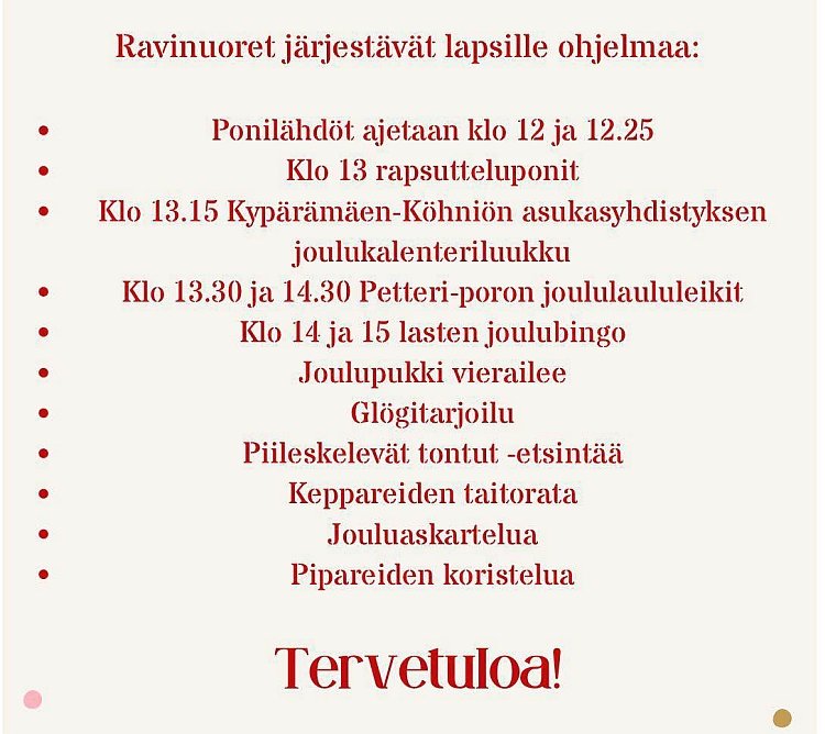 Koko perheen ilmaisravit Killerillä sunnuntaina 30.11. klo 13!