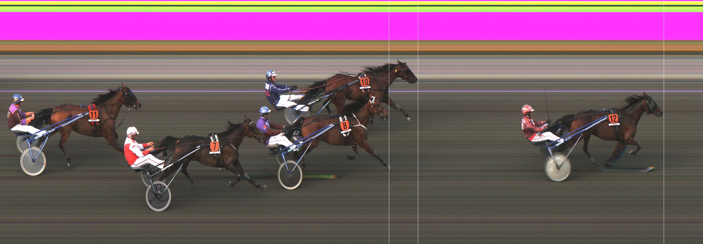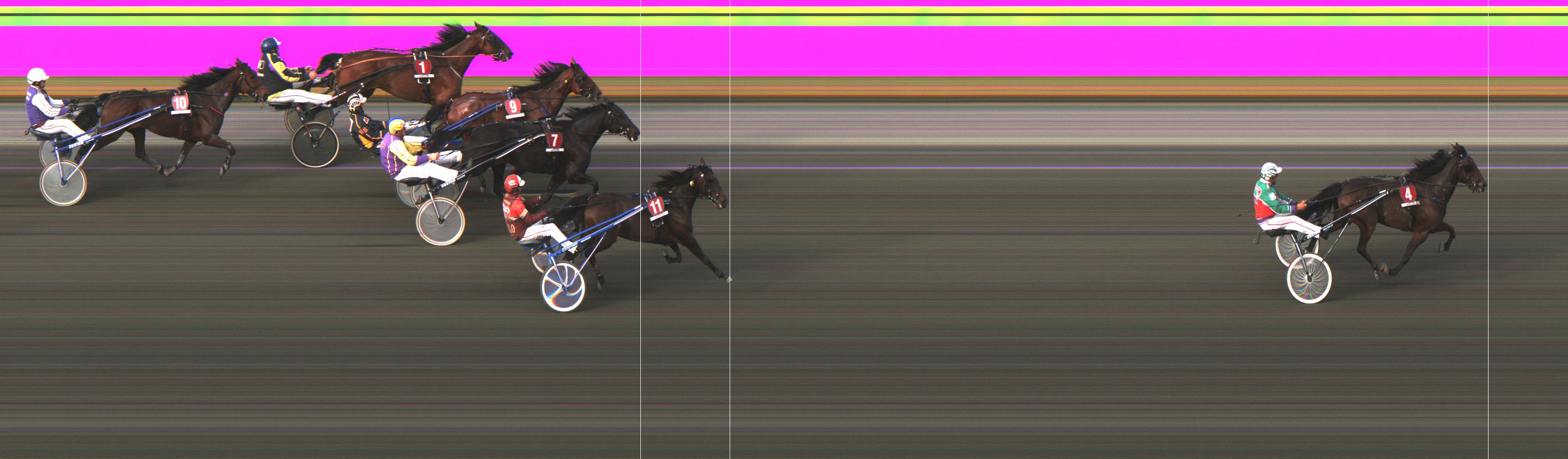 HURMAN VIESKER: Nousi 1. takasuoralla harvassa porukassa 4. sisältä johtavan rinnalle, pudotti kierros jäljellä 2. sisälle. Nousi maalisuoralle toiselle ja otti lopulta selvän voiton kun Siskotuuli pilasi vajaa 100 jäljellä laukkaan.