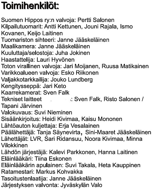 K.P. SALAMA: Laukkasi 2. kurvin alussa 3. ulkoa jääden taustalle. Nousi etusuoralla kolmannen jonoon, käänsi 800 jäljellä neljännelle ja eteni heittämällä kohti kärkeä. Haki johtopaikan 500 jäljellä ja irtosi vielä selvään voittoon.