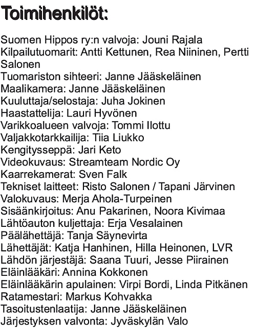 1: 7 Hamis Fameraiser (6,11) 2: 3 Pimukka, 5 Rankkari, 6 Oleg, 7 Liekin Muisto, 9 Tutun Tiltu (2,1) 3: 2 Siinan Tähti, 3 Akimin, 6 Mirkan Mosse, 12 Suvilei, 14 Taajanvaltti (16,15) 4: 1 La Can Star Chip, 5 Caakao, 11 Coldspring (4,8)