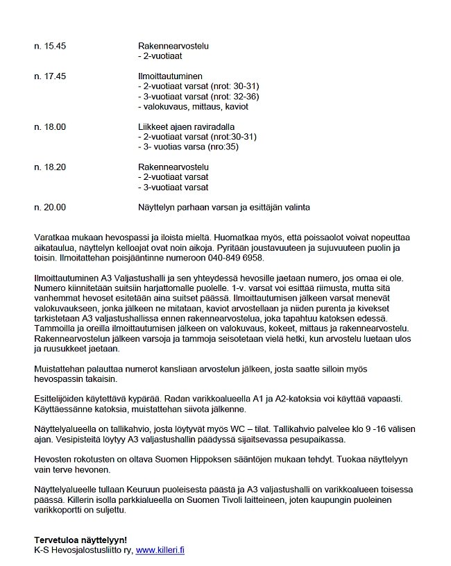 Jyväskylän Killerillä pidettiin tamma – ja varsanäyttely lauantaina 27.9. Hevosia esitettiin yhteensä 26 kappaletta, joista yhdeksän oli aikuisia tammoja.